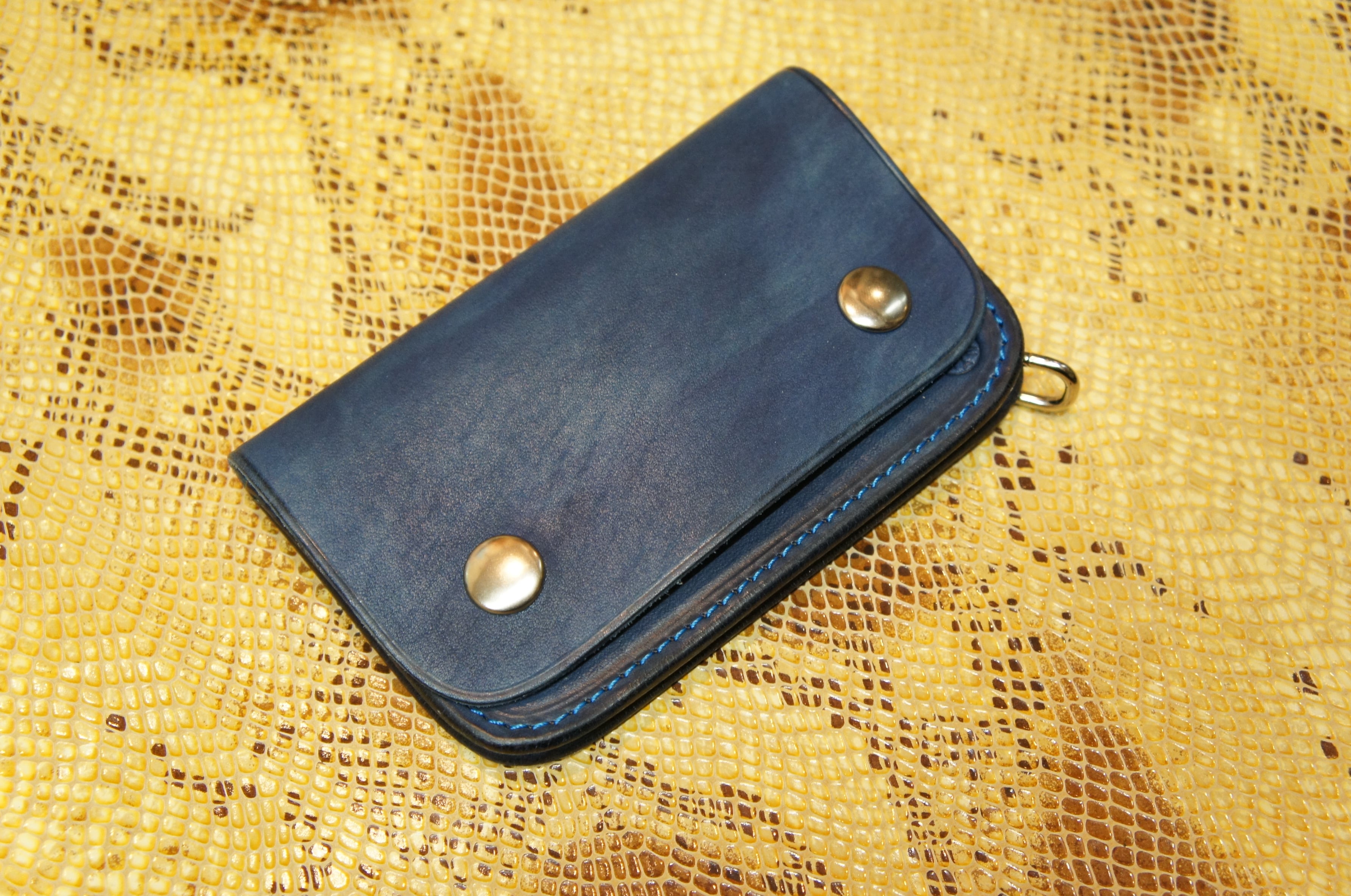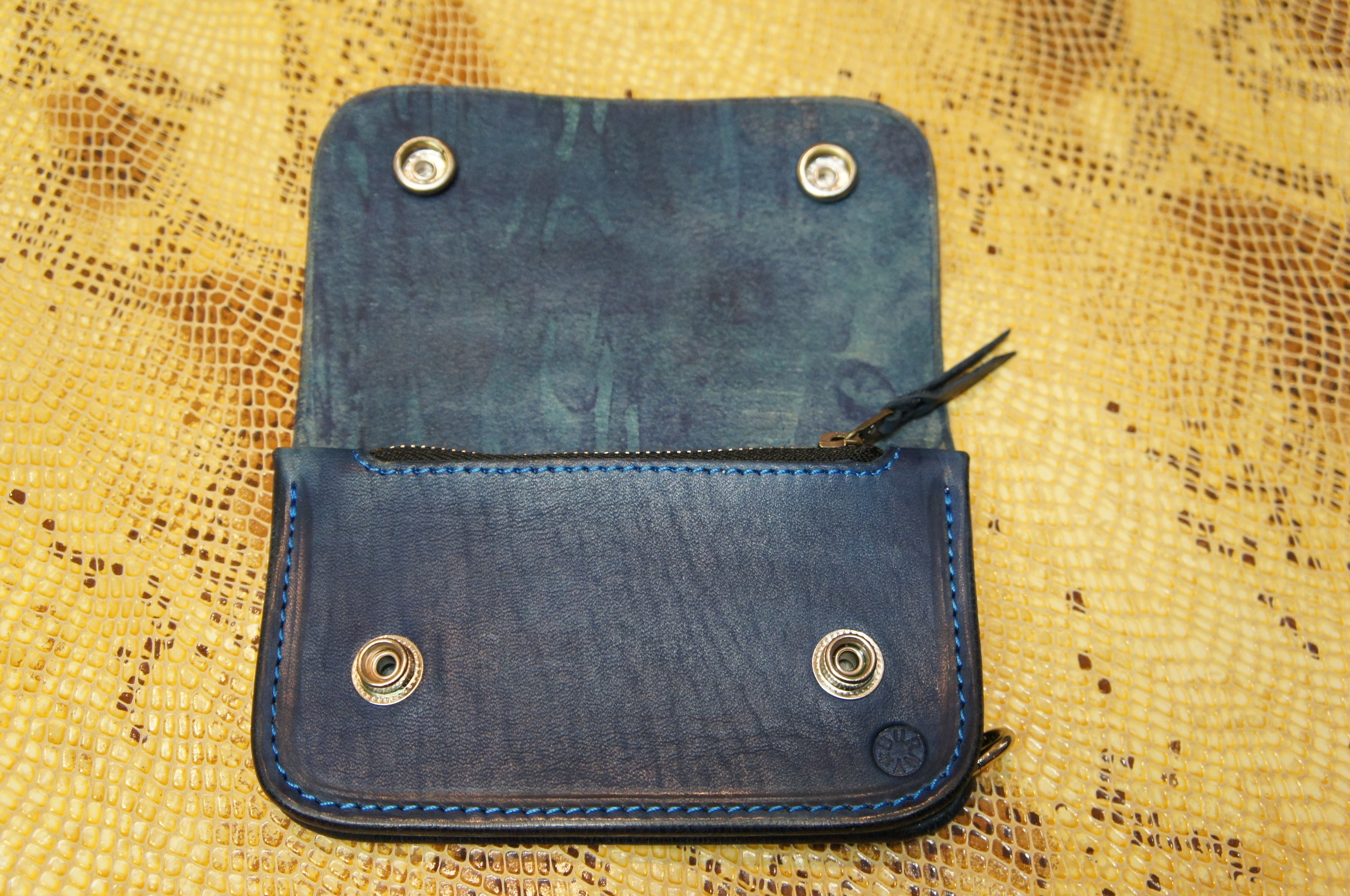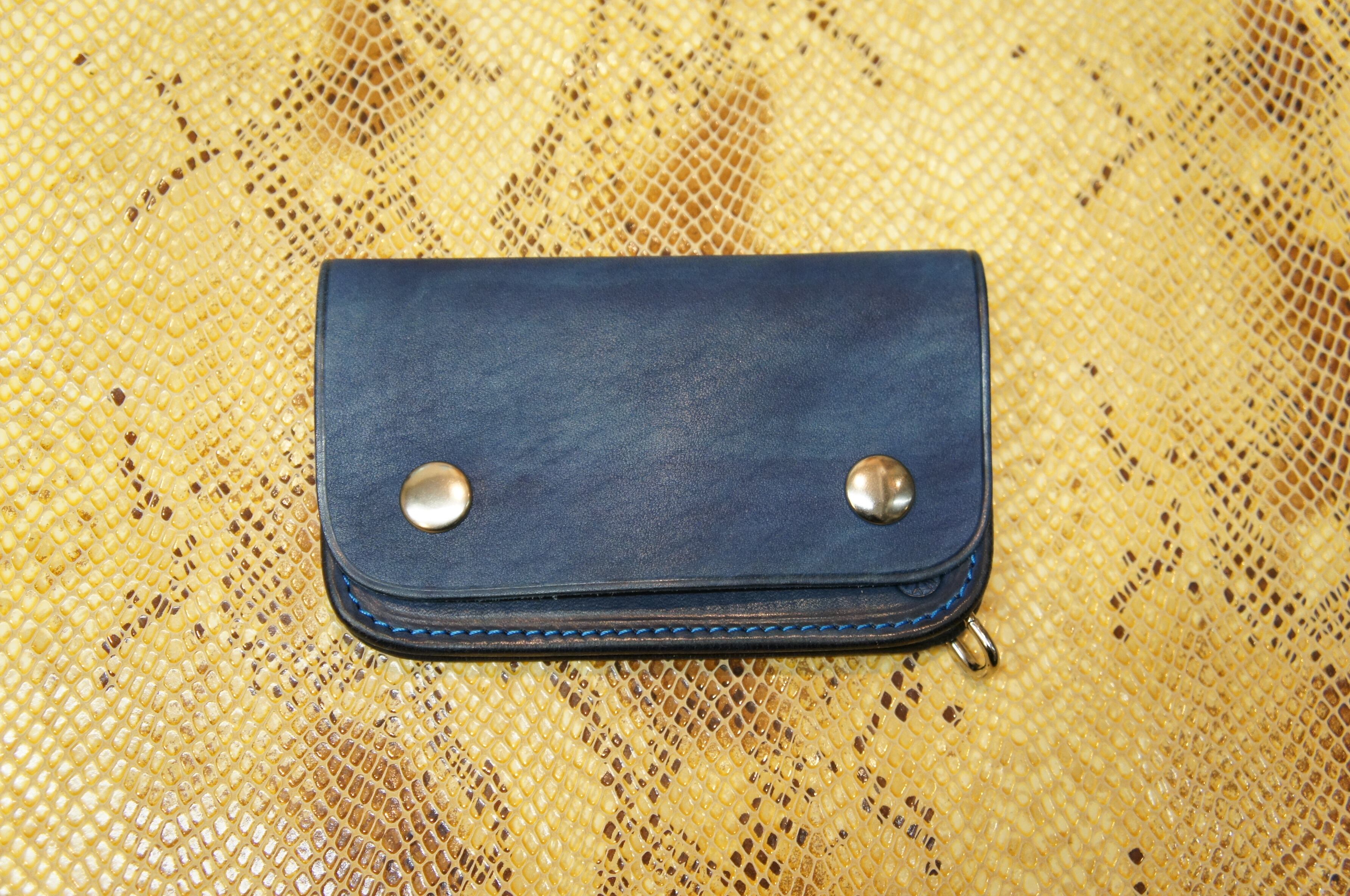 牛ヌメ革製 ミニトラッカーウォレット N085 紺色 ネイビー色 BURNY 本革 バイカーウォレット レザー 財布