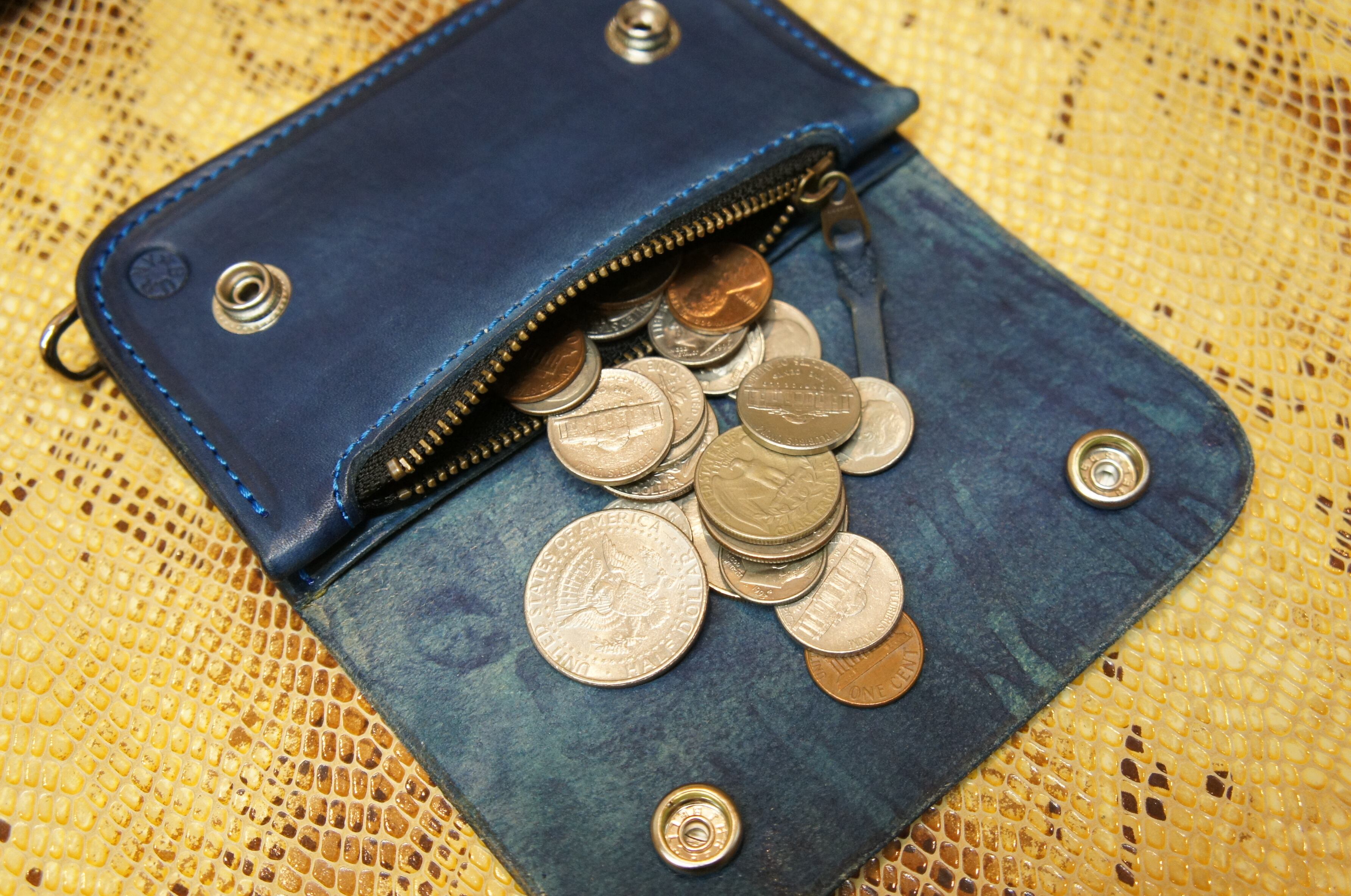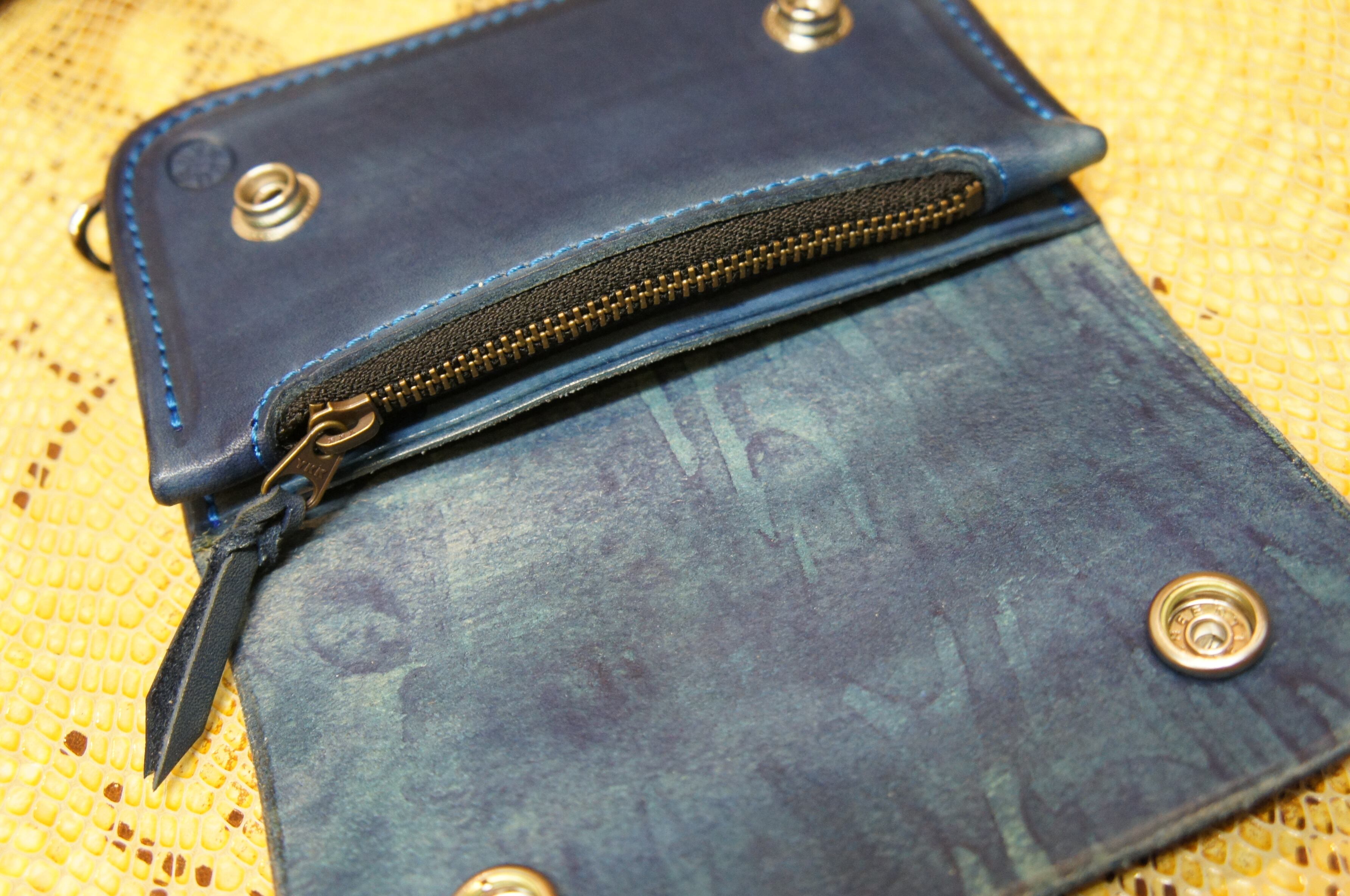 青色のトラッカーウォレットは、カジュアルながらもエレガントな印象を与えます。使いやすいコンパクトサイズで、ポケットにすっぽり収まるため、外出先でも便利です。また、ヌメ革ならではの経年変化も楽しめ、ユーザーの個性と共に成長していくアイテムです。